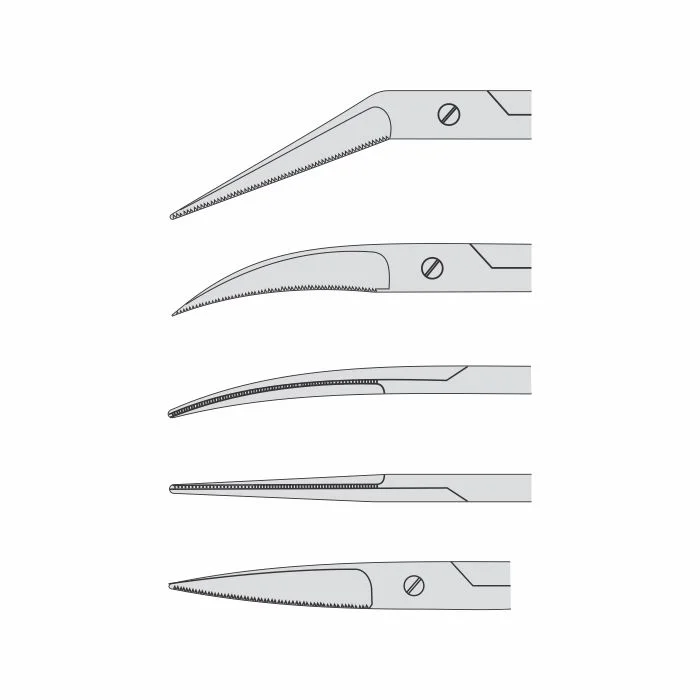 One blade is with fine serrations to avoid tissue or ligature slippage.